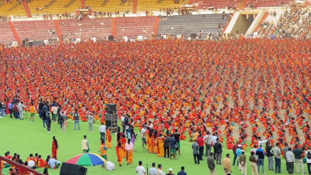 সজীৱ পৰম্পৰাগত সাজ-পোছাক পৰিধান কৰি হাজাৰ হাজাৰ বড়ো শিল্পীয়ে আজি সৰুসজাই ষ্টেডিয়ামত অৰ্জুন ভোগেশ্বৰ বৰুৱা ক্ৰীড়া কমপ্লেক্সত ভৰি দি গিনিজ ৱৰ্ল্ড ৰেকৰ্ড নিশ্চিত কৰাৰ লক্ষ্যৰে চিনাকি বাগুৰুম্বা লোকনৃত্যৰ সমন্বিত প্ৰদৰ্শনেৰে দৰ্শকক মোহিত কৰে। প্ৰধানমন্ত্ৰী নৰেন্দ্ৰ মোদীয়ে গুৱাহাটীত উপস্থিত হোৱাৰ লগে লগে এই ভয়ংকৰ দৃশ্য প্ৰত্যক্ষ কৰি দুদিনীয়া অসম ভ্ৰমণৰ অংশ হিচাপে অনুষ্ঠানটোৰ ৰাষ্ট্ৰীয় তাৎপৰ্যৰ ওপৰত আলোকপাত কৰে। চৰাই আৰু প্ৰকৃতিৰ অনুকৰণ কৰি ৰূপৱতী গতিবিধিৰ বাবে পৰিচিত এই পখিলা নৃত্যত মহিলাসকলে ৰঙীন ডক্খা, জুমগ্ৰা আৰু আৰোনাই পিন্ধি খাম, ছিফুং আৰু চেৰ্জাৰ দৰে বাদ্যযন্ত্ৰৰ সংগীত পৰিবেশন কৰিছিল।
